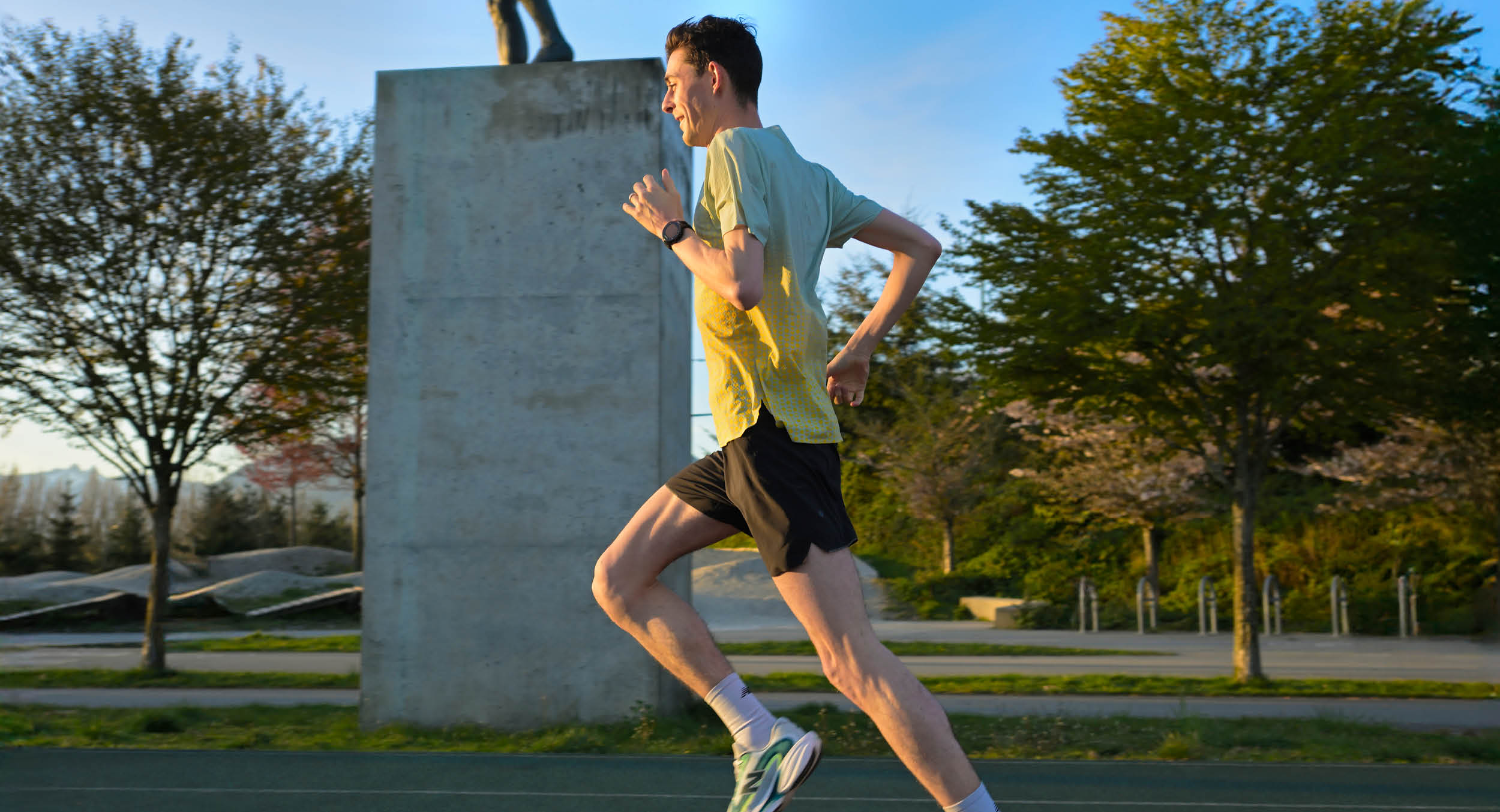He trains every day, sometimes twice a day, split between track and road for interval-focused sessions and two long runs clocking in 100 miles a week. He also does two strength sessions in his home gym. His volume will increase at the end of the year when training becomes more marathon focused. Lee says these will be more long, sustained tempo efforts with higher volume—upwards of 160-180 kilometres a week.