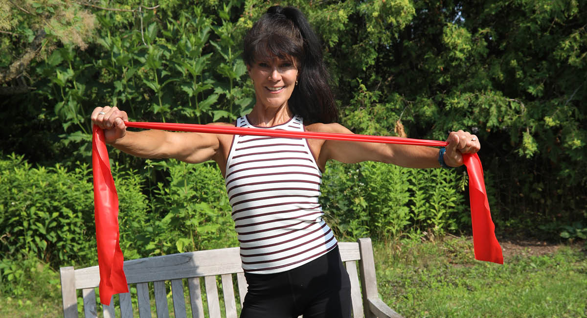 - With both hands grab the other end of the resistance band and extend band overhead.