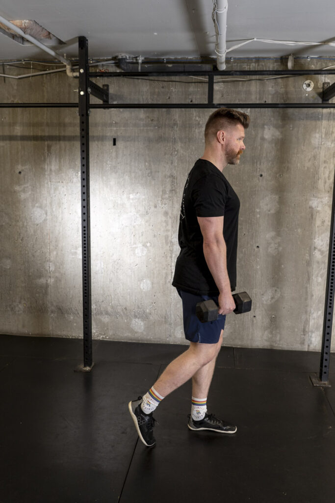 Focus on control through the lower leg, keep the hips square to the ground as you raise your back leg and let your torso tilt down. Focus on lifting the back leg rather than bending at the waist, focusing on targeting the hamstring of the supporting leg rather than how far down the dumbbell goes. Once you come back to standing, we’re going right into a step-back lunge so we can target the glute of that same leg all in one movement.