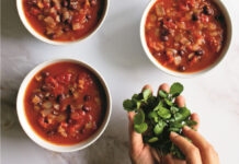 Follow directions on Vietnamese rice paper package, typically suggesting to soak in warm water for10-20 seconds. Once pliable, place on cutting board. Add bean and avocado mixture, top with mango salsa and roll up and enjoy!