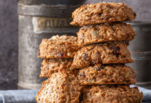 Once the wet mixture is thin, switch off the heat and stir in the vanilla. Slowly pour the wet ingredients into the dry bowl, stirring well to coat the dry ingredients. Finally, stir in the dried fruit.