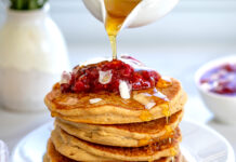 Add raspberries, maple syrup and water to a small saucepan. Stir continuously over a low heat, until the mixture starts to bubble. Take off the heat and mix together with a potato masher. Add the chia seeds and stir well. Leave for a few minutes as the jam sets (or rather the chia seeds begin to swell up). Place jam into a bowl in the fridge to cool – it will continue to thicken.