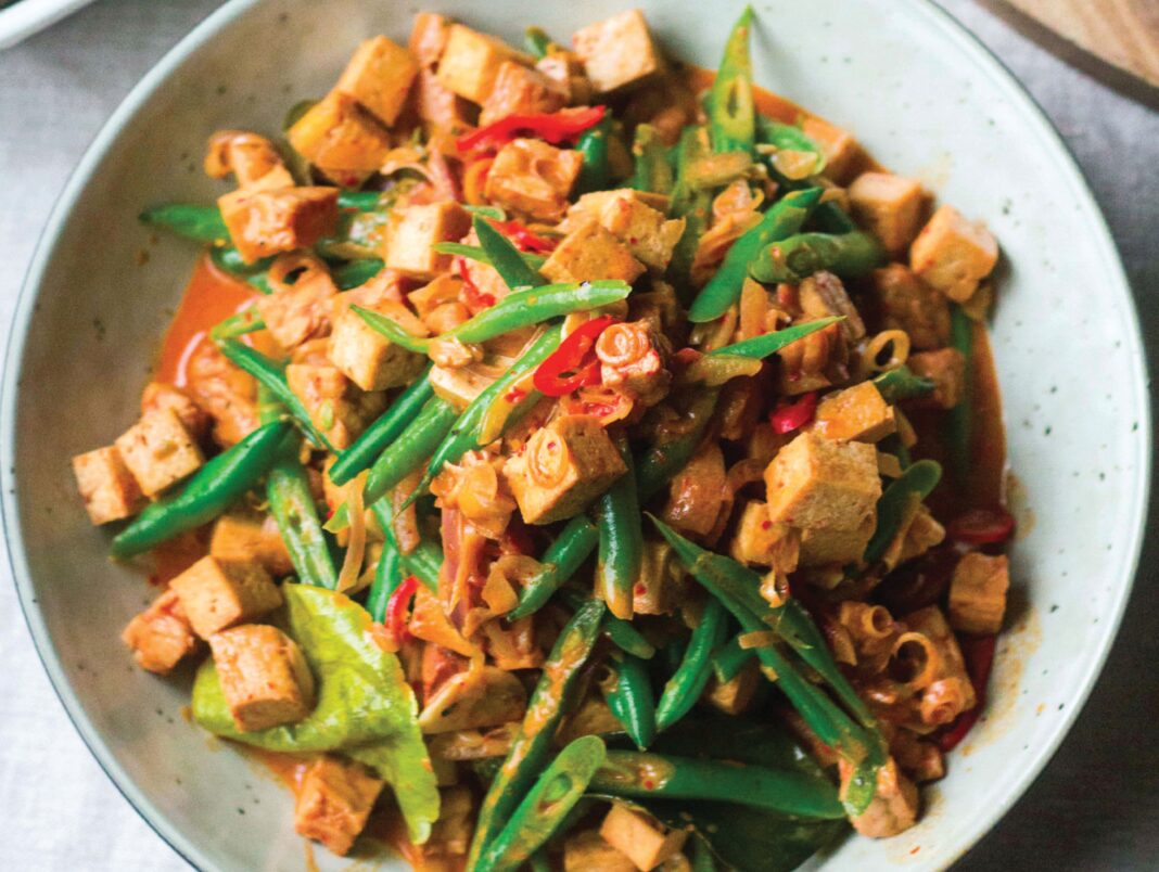 Sweat the aromatics for 3 minutes or until they turn soft and translucent, then add the fried tempeh, tofu, coconut cream, tamarind concentrate, sugar, salt, and ¾ cup water. Bring to a simmer. Add the blanched green beans and stir them through.