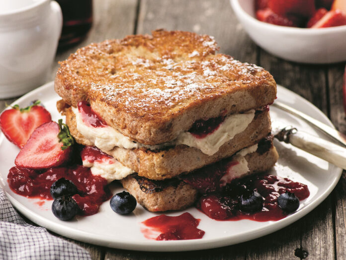 7. To serve, place six slices of the French toast on a work surface. Generously spread the mascarpone over each slice, followed by a layer of strawberry compote. For each serving, stack two slices of French toast, slathered with the mascarpone and strawberry compote, on top of one another. Top each stack with a plain slice of French toast. Serve immediately with maple syrup and fresh berries, if using.